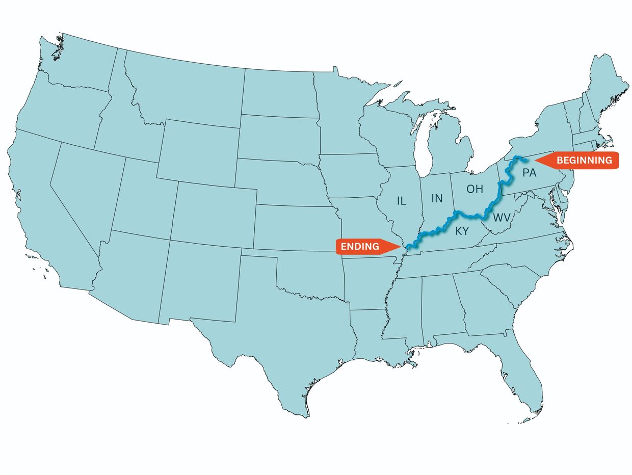 The Ohio River flows from east to west. It begins in Pittsburgh, Pennsylvania, and ends in Cairo, Illinois. The 981-mile (1,579 km) river borders six U.S. states.